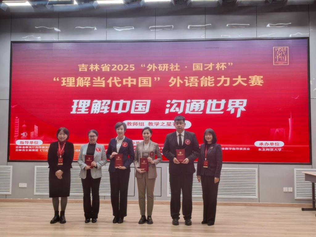 11月9日,吉林省2025年“外研社·国才杯”“理解当代中国”外语能力大赛(教师组·教学之星)决赛在东北师范大学圆满落幕。由我校语言文化学院王耀珩、吉晶、王迪、李丹琪、孙婉婷五位教师组成的教学团队,凭借扎实的专业功底与出色的教学创新表现,从全省30多支参赛队伍中脱颖而出,最终以总分第二名的优异成绩斩获金奖。