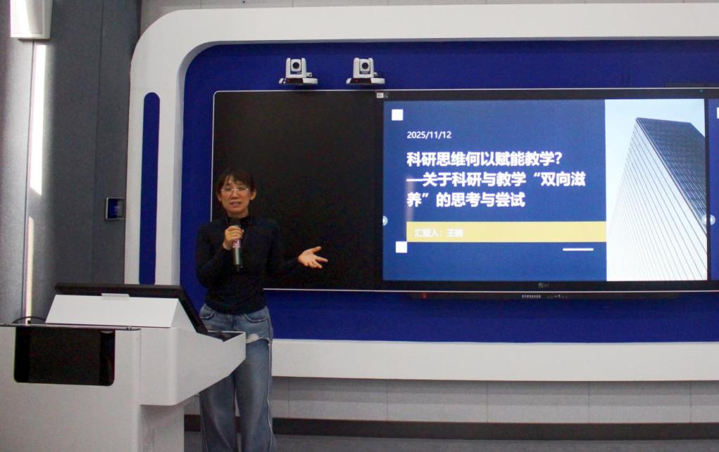 管理科学与信息工程学院王楠教授以“科研与教学的‘双向滋养’实践”为题进行交流。她基于申报多个教研项目的经历,阐述如何将机器学习、自然语言处理等科研方向的前沿成果转化为教学创新实践,并提出教学是科研的“富矿”,是观察窗口与实践场域,同时也分享了最新的教学研究设计与数据集分析设想。